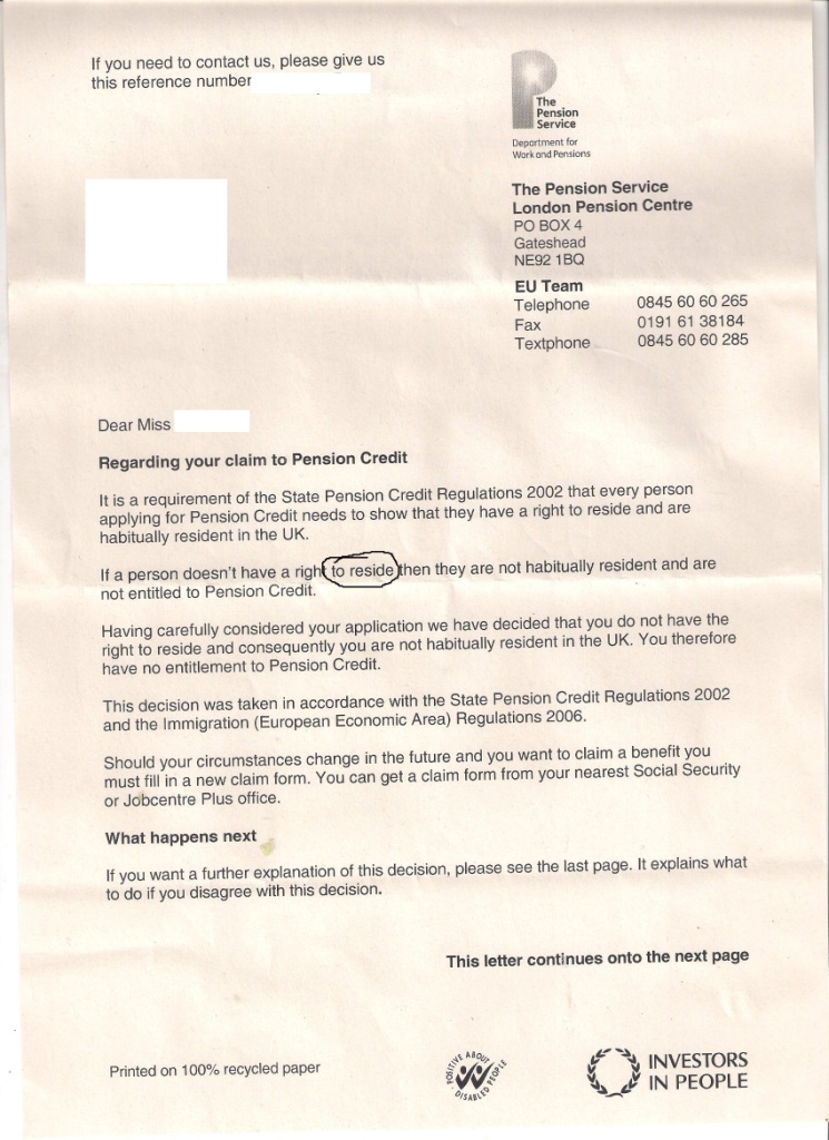 Moja Babcia, lat 76, udała się do CAB około 3 miesięcy temu z zapytaniem, czy może pobierać Pension Credit.Nadmieniła, że w Polsce pobiera emeryturę, przyjechała do UK w listopadzie 2011 i od tego czasu mieszka na stałe u swojej córki.