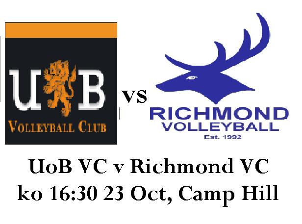 zapraszam wszystkich fanow siatkowki na mecz 1 ligi siatkowki mezczyzn, ktory odbedzie sie 23.10 o godz 16.00 w Moseley , Birmingham. Po rozegranych 3 meczach, zespol akademikow zajmuje 5 pozycje w lidze, z dwoma wygranymi i jedna przegrana. Dzieki wzmocnieniom w ataku i ciezkiej pracy w obronie, UoB moze liczyc na dobry wynik w nadchodzacym meczu przeciwko Richmond VC. Zespol z Londynu zgromadzil dotychczas 8 punktow, wygrywajac 2 mecze i ponaszac porazki w kolejnych 2. Richmon VC plasuje sie o jedna pozycje wyzej od zespolu z Birmingham, takze zanosi sie na zaciety pojedynek!